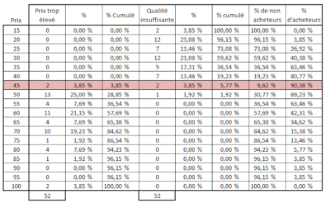 Le prix psychologique s'établit grâce à un tableau et des réponses à 2 questions. Le prix psychologique est le prix pour lequel il existe le plus grand nombre de consommateurs i. Vous pouvez toutefois aller plus loin, en préparant un tableau de prix possibles, et en posant deux questions à vos clients cible Le prix psychologique, couramment appelé prix d'acceptabilité, désigne un prix de référence.
