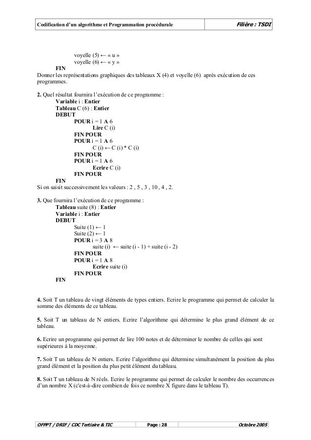 Remplir un tableau de valeurs hexadécimales. La trace t d'une matrice carrée k3,3 2 3. Ecrire un algorithme qui renverse un tableau (si le tableau est trié en ordre croissant, il 12. Il a été proposé pour la première fois par b.