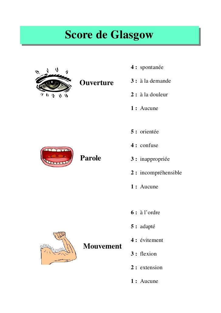 Pics. Le score de glasgow est donc aussi une échelle de coma. Elle consiste à tester trois paramètres :