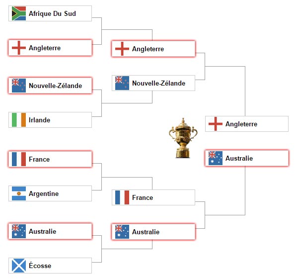 On connaît à présent le tableau officiel des quarts de finale du mondial, marqué notamment par un choc au sommet entre les all blacks et l'irlande. Scores en direct de coupe du monde 2019, à venir, classements. Avec tableau coupe du monde rugby 2011, vous saurez alors quels seront les rencontres de la phase finale, sans effort.